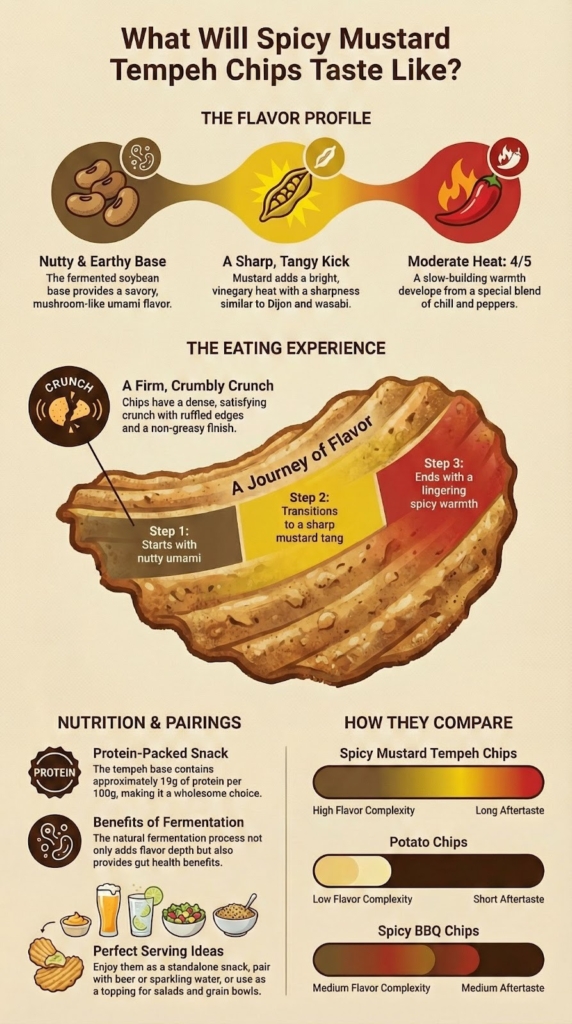 Spicy mustard tempeh chips deliver a clear sequence of flavors. You first taste a nutty umami base from fermented soybeans, followed by sharp mustard heat. Vinegary brightness lifts the flavor and prevents it from feeling heavy. Together, these elements create tangy spicy bites with a savory soy crisp finish.