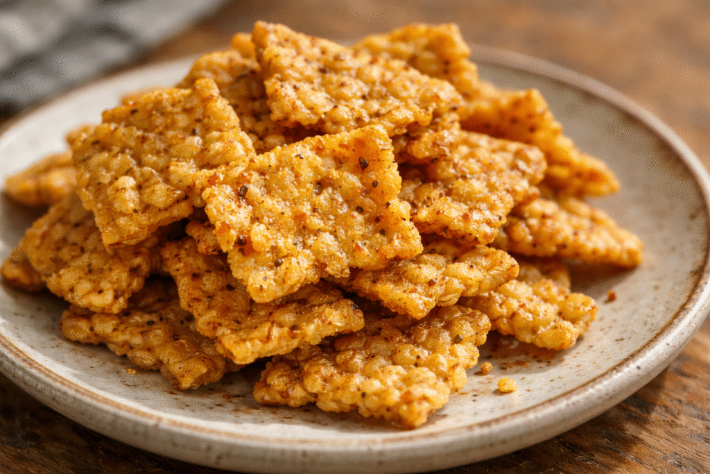 Spicy mustard tempeh chips are easy to snack on despite their bold flavor. The texture stays light and crunchy, whether they are baked tempeh snacks or deep-fried tempeh. Combined with protein-packed spicy flavor, they feel filling without being greasy or overwhelming, making them suitable for repeated snacking.